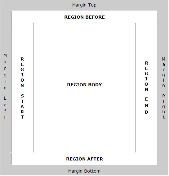 Note:region-before, region-after, region-start, and region-end are part of the main area. To avoid the text of the main area from overlapping these regions, the margins of the main area must be at least equal to the size of other areas.